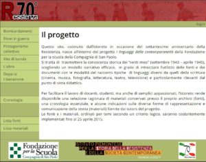 Tale sito nasce all’interno del progetto I linguaggi della contemporaneità della Fondazione per la scuola della Compagnia di San Paolo con lo scopo di trasmettere la conoscenza storica dei “venti mesi” (settembre 1943 – aprile 1945), scegliendo un modello narrativo efficace, in grado di intrecciare l’utilizzo delle fonti e dei documenti con le modalità del racconto tipiche di linguaggi diversi da quelli della scrittura (cinema, musica, fotografia, letteratura, teatro, televisione) e particolarmente rilevanti dal punto di vista didattico. (link al percorso)
