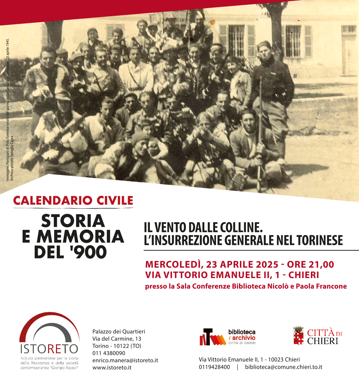Il 23 aprile 2025 dalle ore 21 alle 23 nella sala conferenze della Biblioteca Francone di Chieri, in occasione dell’80° anniversario dalla Liberazione dal nazifascismo, si terrà l’ incontro tenuto dalla dott.ssa Valentina Colombi, storica e archivista, dal titolo “Il vento