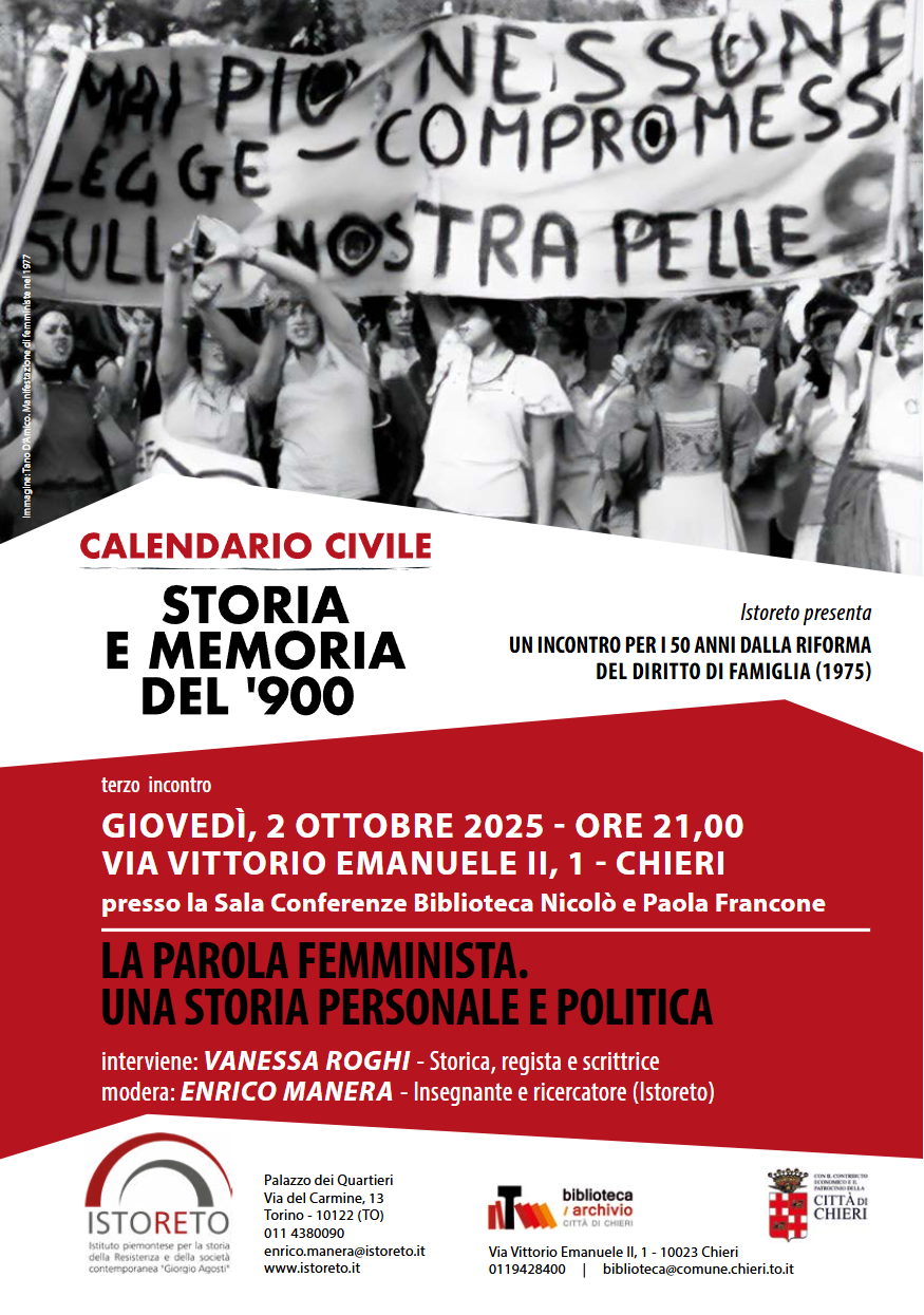 Il 2 ottobre 2025 dalle ore 21 alle 23 nella sala conferenze della Biblioteca Francone di Chieri (via Vittorio Emanuele II, 1), in occasione dell’50° anniversario dalla riforma del diritto di famiglia, si terrà l’incontro tenuto dalla dott.ssa Vanessa Roghi, storica, scrittrice e regista, autrice del recente La parola femminista. Una storia personale e politica (Mondadori 2024).