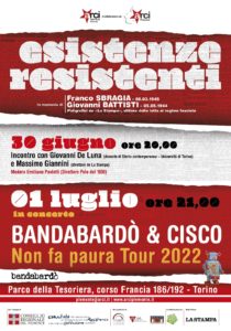 Giovedì 30 giugno e venerdì 1 luglio il Parco della Tesoriera di Torino (Corso Francia, 186/192), nell’ambito dell’EvergreenFest, ospita «ESISTENZE RESISTENTI», evento organizzato dal Comitato Resistenza e Costituzione del Consiglio regionale del Piemonte, in collaborazione con Arci Valle Susa Pinerolo, e dedicato a Franco SBRAGIA e a Giovanni BATTISTI, poligrafici de «La Stampa» e vittime della lotta al regime fascista.