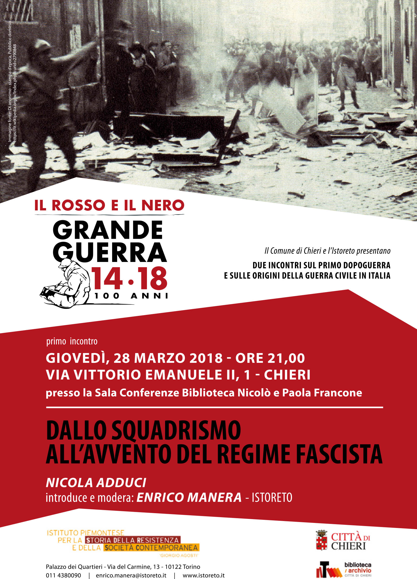 Per la serie di incontri Il rosso e il nero sul primo dopoguerra e sulle origini della guerra civile in Italia, Nicola Adduci interviene sul tema Dallo squadrismo all’avvento del regime fascista. Introduce e modera Enrico Manera (istoreto).