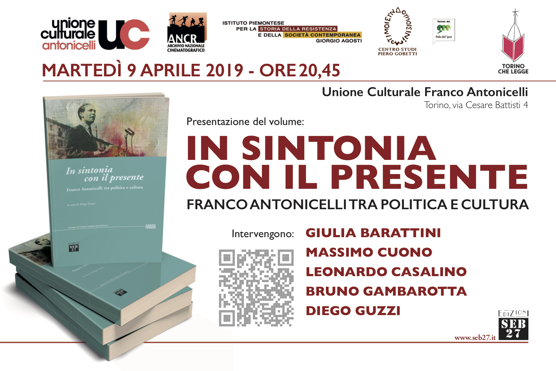 Presentazione del volume In sintonia con il presente. Franco Antonicelli tra politica e cultura (Seb27, 2019), curato da Diego Guzzi, vicepresidente dell’Unione culturale Franco Antonicelli. Il libro raccoglie interventi di: Patrizia Antonicelli, Barbara Berruti, Leonardo Casalino, Chiara Colombini, Marco Gobetti, Paola Olivetti, Claudio Panella, Pietro Polito.