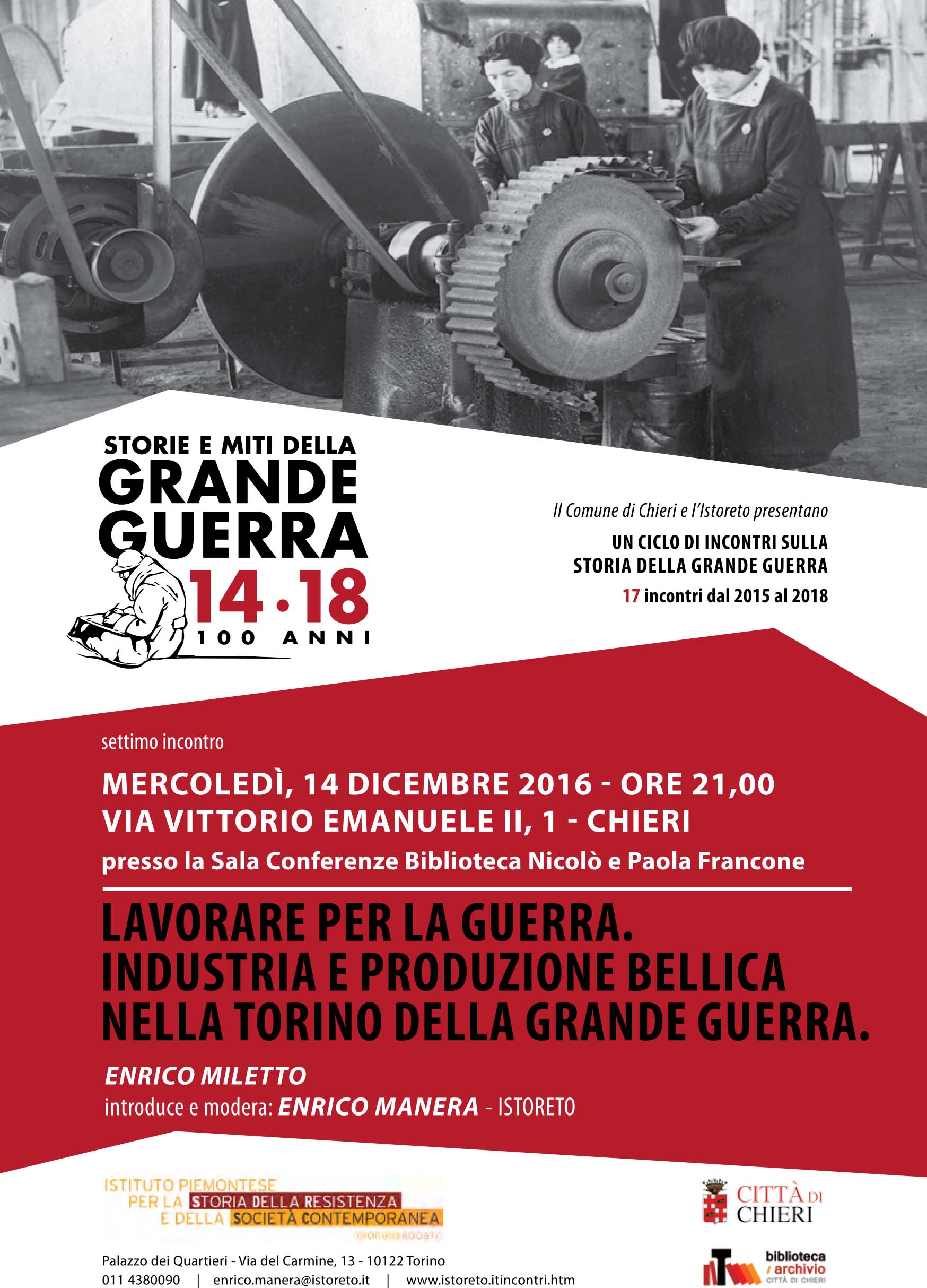 Per il ciclo di incontri “Storie e miti della Grande guerra”, l’incontro affronta il tema Lavorare per la guerra. Industria e produzione bellica nella Torino della Grande Guerra. Relatore Enrico Miletto. Modera Enrico Manera. Promosso dal Comune di Chieri e a cura dall’Istoreto.
