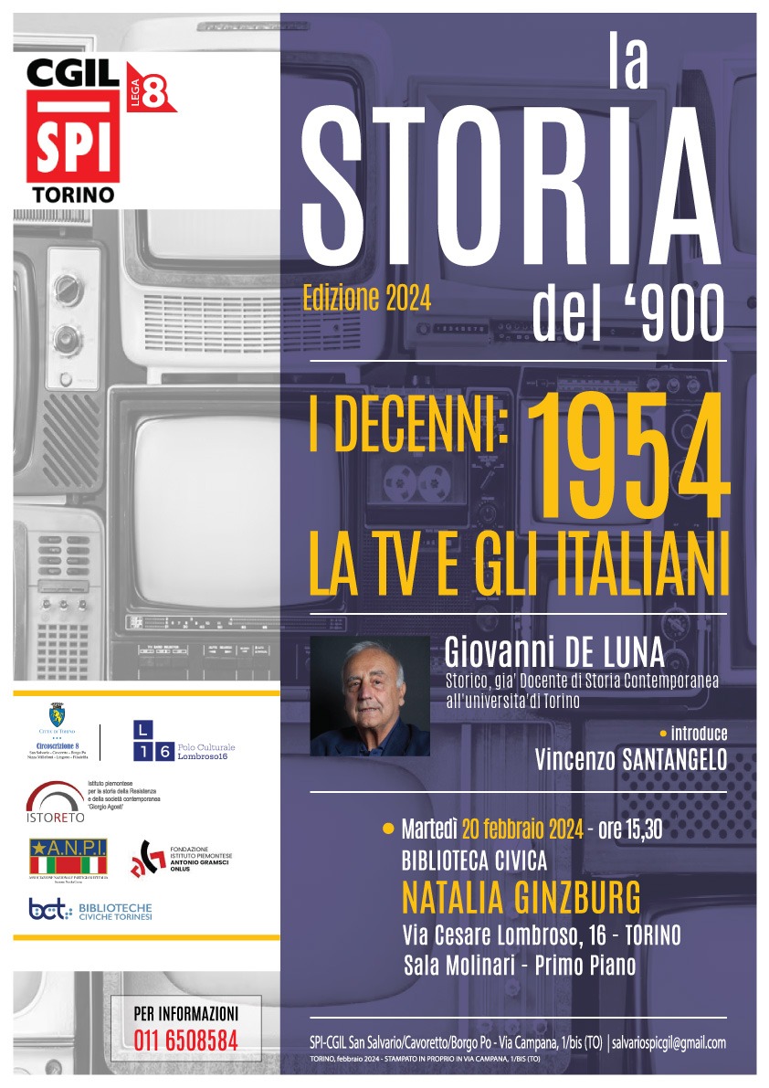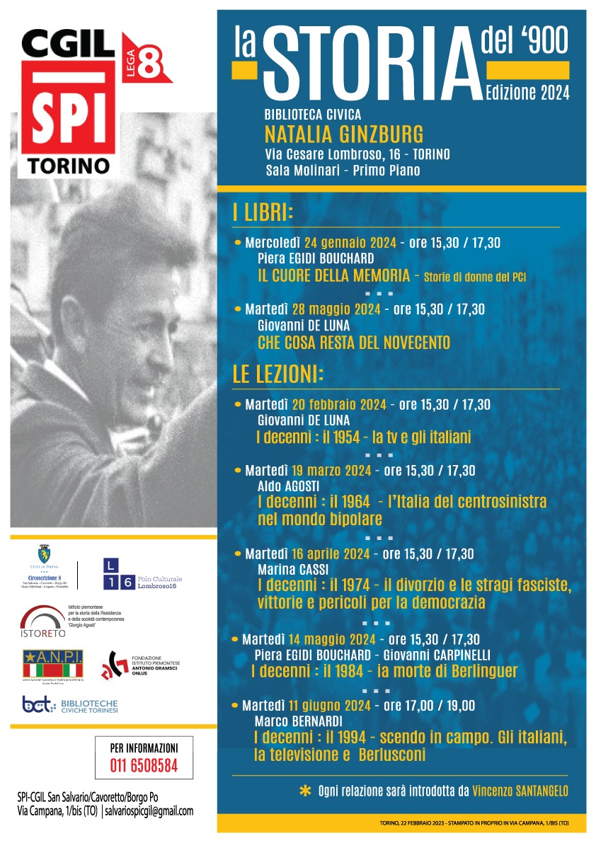 Ciclo di lezioni presso Biblioteca civica Natalia Ginzburg, via Cesare Lombroso, 16 Torino Sala Molinari 1^ piano – ore 15,30 – organizzato da Istoreto, CGIL -SPI e Biblioteche civiche torinesi. A cura di Vincenzo Santangelo. clicca qui per il programma