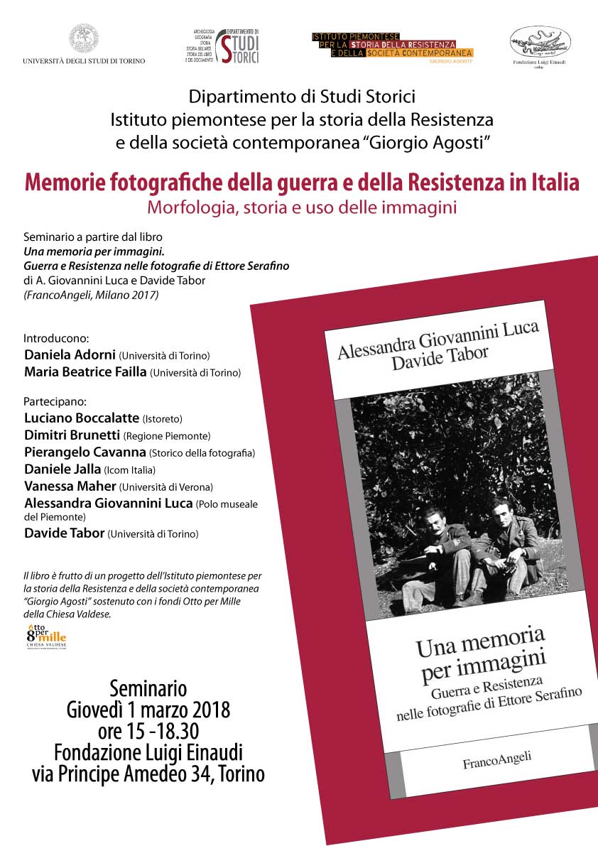 Seminario a partire dal libro Una memoria per immagini. Guerra e Resistenza nelle fotografie di Ettore Serafino di Alessandra Giovannini Luca e Davide Tabor. Introducono Daniela Dorna, Maria Beatrice Falla. Partecipano Luciano Boccalatte, Dimitri Brunetti, Pierangelo Cavanna, Daniele Jalla, Vanessa Maher e gli autori del volume.