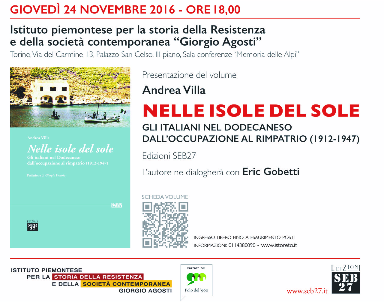 Presentazione del volume di Andrea Villa (SEB27, 2016) che ricostruisce gli avvenimenti della presenza italiana nel Dodecaneso attraverso i documenti d’archivio, le testimonianze e le memorie di tante “piccole storie” individuali e collettive, cercando di restituire la complessità della vicenda storica e l’umanità dei suoi protagonisti.