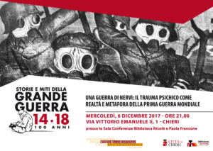 Per il ciclo di incontri “Storie e miti della Grande guerra”, l’incontro affronta il tema Una guerra di nervi: il trauma psichico come realtà e metafora della prima guerra mondiale. Relatore Francesco Cassata. Modera Enrico Manera. Promosso dal Comune di Chieri e a cura dall’Istoreto.